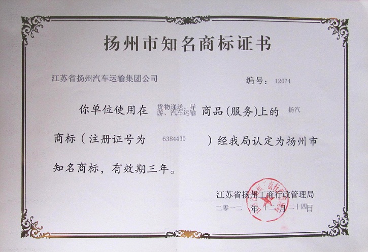 近日,集團(tuán)公司注冊(cè)的證號(hào)為6384430的“揚(yáng)汽”商標(biāo)(貨物遞送、導(dǎo)游、汽車運(yùn)輸)被揚(yáng)州市工商行政管理局認(rèn)定為“揚(yáng)州市知名商標(biāo)”。