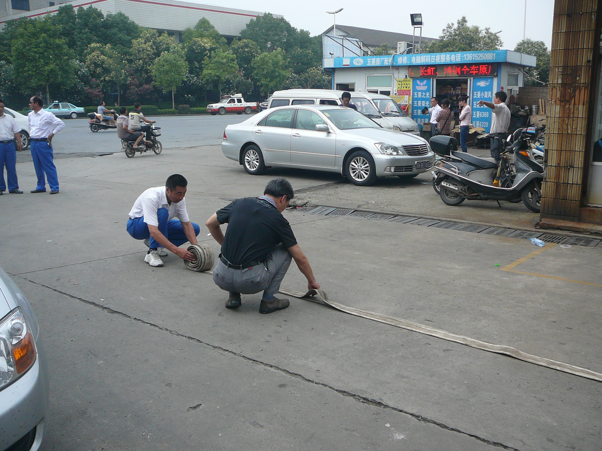 在活動現(xiàn)場,消防隊員每兩人一組,進行撒水帶、連接消防接口等方法的演練。隊員們一絲不茍地按照工作流程進行著操作,并熟練地掌握了消防栓連接操作要領,即用手卡住水帶,小手臂用力,向前方拋出四十五度左右時,除拇指和食指外,其余手指自然松開,水帶主體拋出,手中只留兩個接口;將其中一個接口放在地上或就地在消防栓栓口,消防栓出水,分水器口;拿起另一個接口迅速向前方跑去,邊跑邊拿出水槍進行連接。