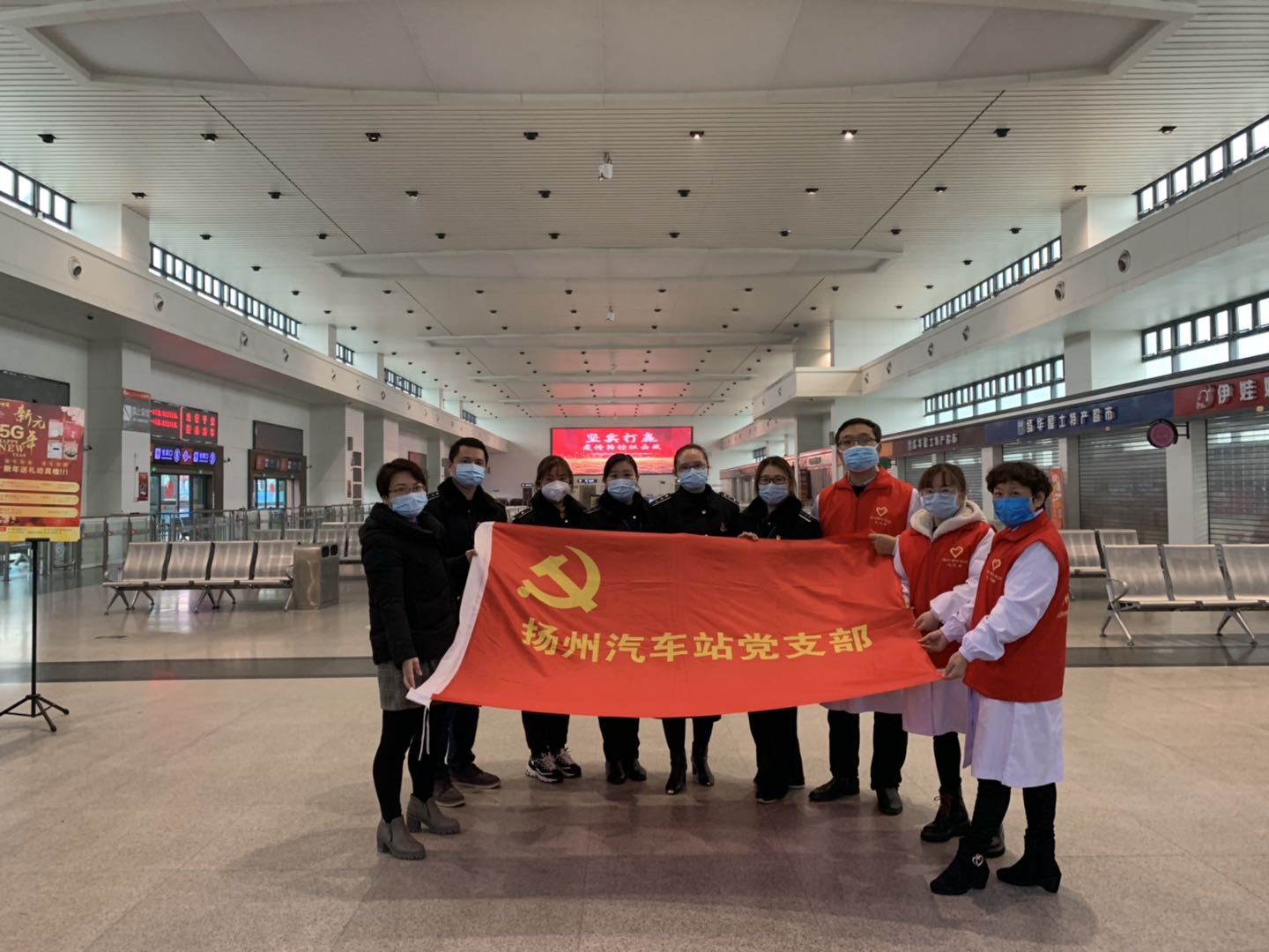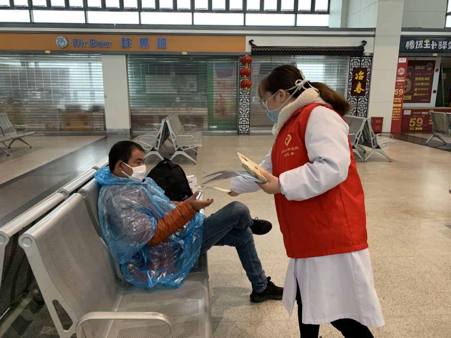 2月25日揚(yáng)州站復(fù)工復(fù)產(chǎn)的第二天,揚(yáng)州市中醫(yī)院抗“疫”小分隊(duì)為揚(yáng)州汽車(chē)站里的旅客們和堅(jiān)守在一線(xiàn)崗位的職工送來(lái)了抗疫藥品和義診服務(wù)。
