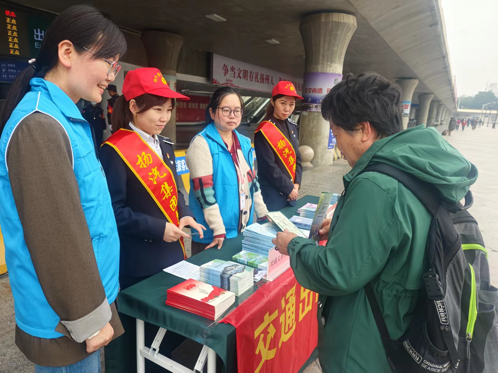 活動現(xiàn)場,志愿者們有序為旅客提供問詢指引、維持秩序、文明勸導(dǎo)等志愿服務(wù),熱情為旅客們介紹揚州的美景、美食以及旅游線路的規(guī)劃,用熱情的服務(wù)態(tài)度和專業(yè)知識,給旅客們帶來了更好地幫助。