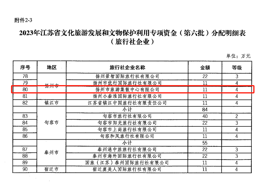 近日,江蘇省財(cái)政廳、江蘇省文化和旅游廳公示了2023年江蘇省文化旅游發(fā)展和文物保護(hù)利用專(zhuān)項(xiàng)資金旅行社企業(yè)名單,揚(yáng)州旅游集散中心成功入選。