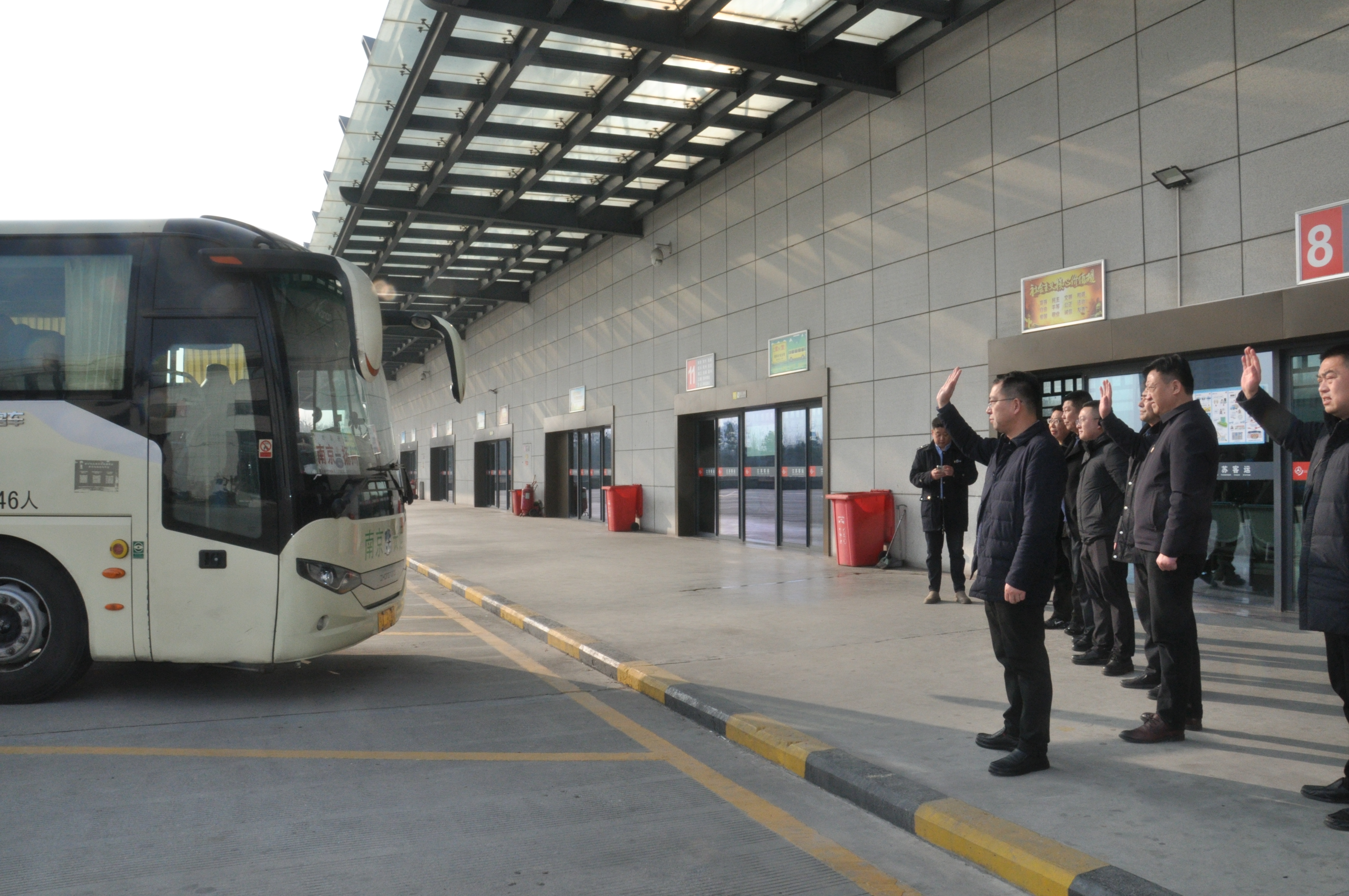 下午3點(diǎn)40分,發(fā)往南京南站的大巴正緩緩駛出車(chē)站。這是除夕當(dāng)天發(fā)出的最后一班“團(tuán)圓班車(chē)”。龔宇峰一行為最后一班車(chē)的旅客送上了新春的祝福,并再三囑咐駕駛員謹(jǐn)慎駕駛,確保將乘客安全送達(dá)目的地。他們還向堅(jiān)守在一線(xiàn)的廣大干部職工表示了誠(chéng)摯的慰問(wèn)與關(guān)懷。在大家的揮手告別中,大巴車(chē)緩緩離開(kāi)了發(fā)車(chē)平臺(tái)。至此,揚(yáng)州汽車(chē)客運(yùn)站節(jié)前的最后一批旅客踏上了返鄉(xiāng)的團(tuán)圓之路。