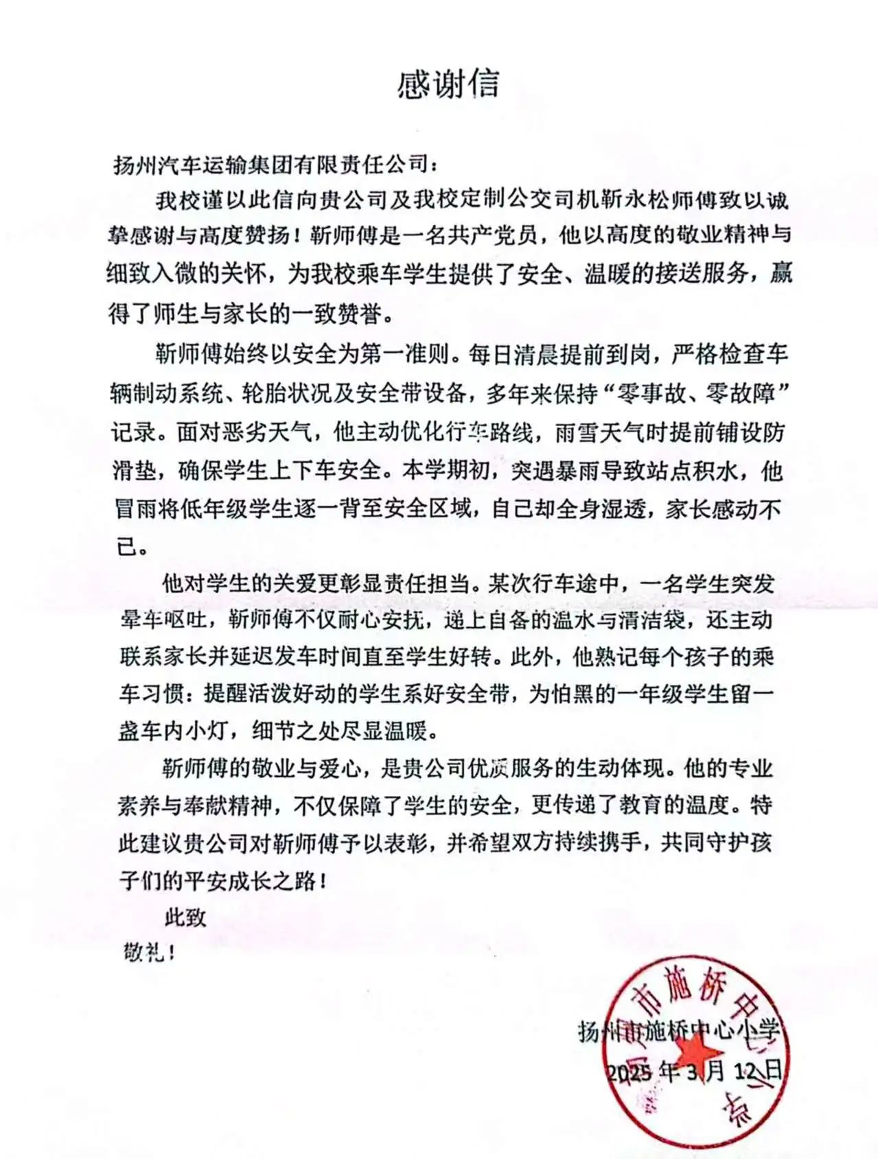 近日,揚(yáng)汽集團(tuán)營銷中心收到來自揚(yáng)州市施橋中心小學(xué)的感謝信,對校車司機(jī)靳永松師傅盡職盡責(zé)的安全護(hù)送服務(wù)以及對學(xué)生們的悉心照顧表示衷心的感謝。
